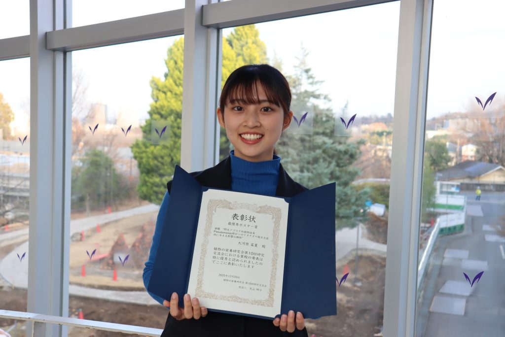 2025年12月19日(金)〜20日(土)に九州大学農学研究院で開催された「植物の栄養研究会 第10回研究交流会」において、農学部農芸化学科植物環境制御学研究室(田畑亮准教授)所属の大河原菜夏さん(学部4年生)が「野生アブラナ科植物由来Pseudomonas群がシロイヌナズナ鉄欠乏症状に与える影響の解析」という演題でポスター発表を行い、多くの学生・博士研究員がエントリーする中、最優秀発表賞を受賞しました。