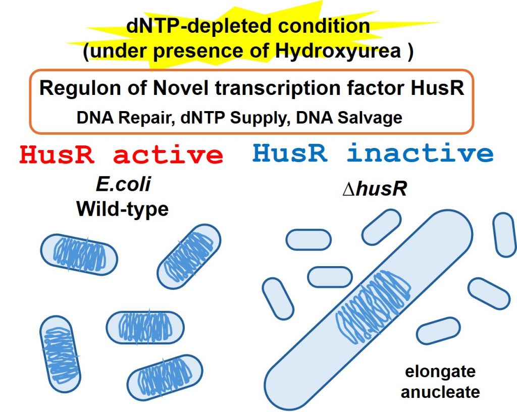 生物がゲノムに持つ遺伝子を選択的に利用する仕組みを理解することは、ポストゲノム時代の生命科学分野における先端的研究課題の一つです。今回、機能未知推定転写因子YnfLの機能解析を行いました。その結果、YnfLがDNAの基質であるdNTPの合成酵素や再利用酵素、また、DNA損傷修復酵素の遺伝子群を活性化していること、また、DNA基質合成酵素阻害剤であるヒドロキシウレアの感受性を決定していることを明らかにしました。さらにYnfLは、長期生存、特に窒素飢餓条件において、重要な役割を担っていることを見出しました。これらYnfLによるゲノム転写制御機構の解析から、微生物がDNAを維持し、長期生存するための新たな仕組みが明らかとなり、YnfLをHusR (hydroxyurea sensitivity regulator)と命名しました。